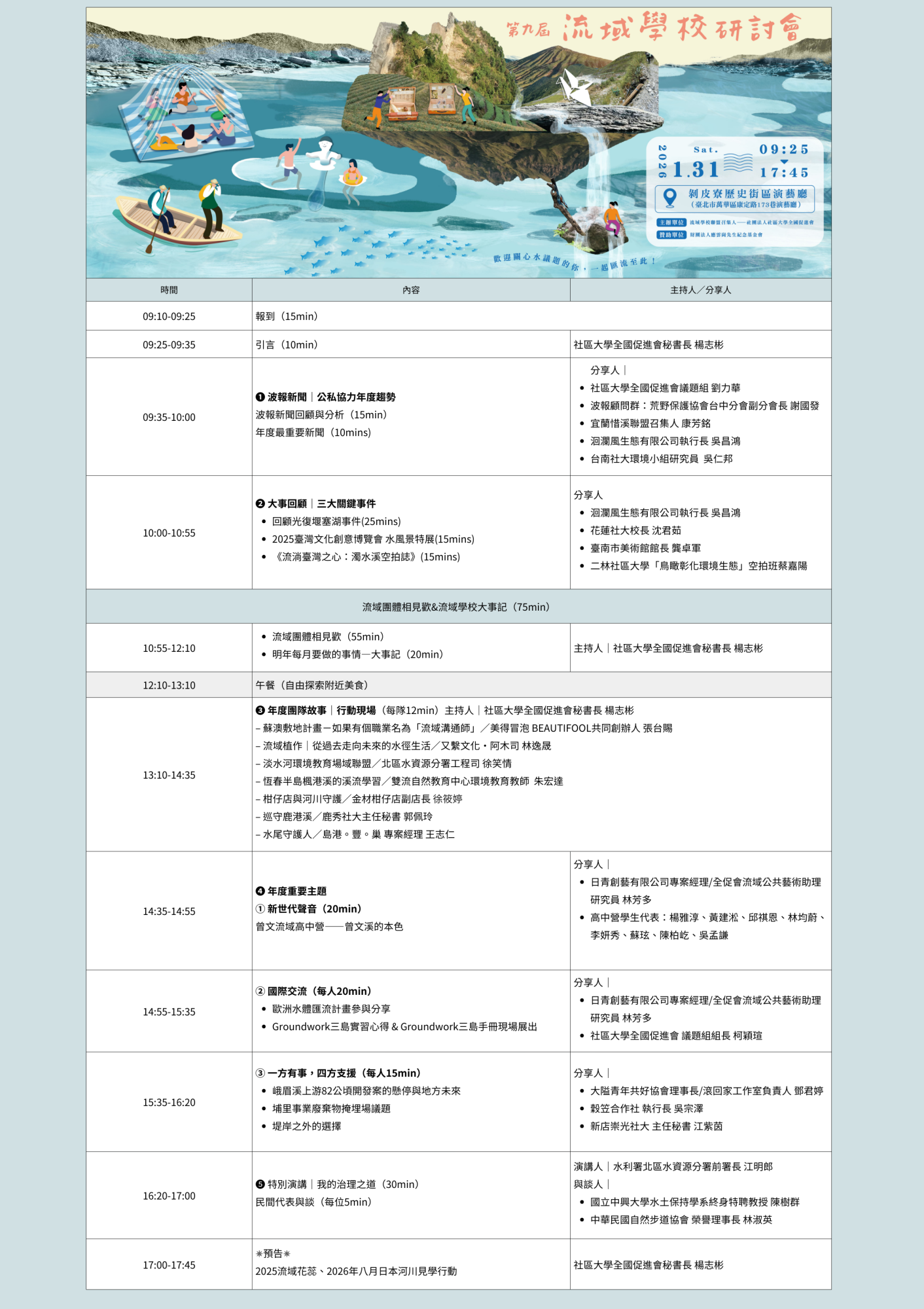 時間| 2026年01月31日(六)09:25–17:45(09:10–09:25 報到)